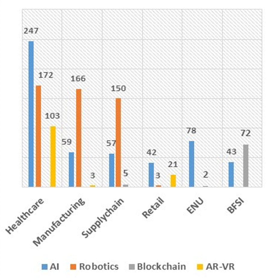 From the perspective of digital technology areas, patenting activity was predominantly observed in AI and Robotics for Healthcare; Robotics in Manufacturing and Supply chain, AI in Retail and ENU; AI followed by Blockchain in BFSI.