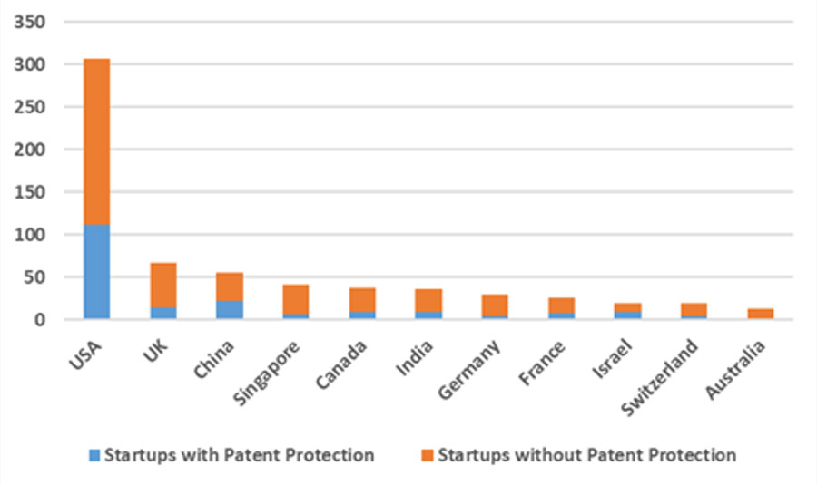 Startups headquartered in China are actively filing patents with 37% having IP protection followed by startups headquartered in USA with 36% having patents.