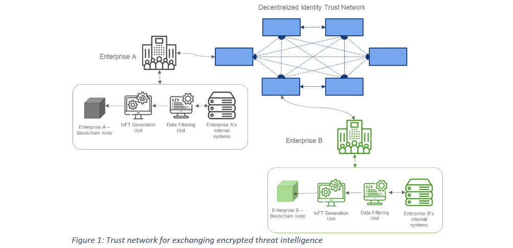 The infographic above depicts a trust network of financial Institutions. In the Figure Enterprise A & Enterprise B are financial institutions, both participants of the trust network. The Enterprises can leverage the decentralized Trust network to exchange CTI information using IoFT among the peer participants of the network. Enterprise A can exchange details of fraudulent transactions that it has identified with the peer organization Enterprise B in privacy preserving manner using IoFT. This would help Enterprise B to address similar fraudulent transactions more effectively, thereby preventing incurring financial losses by such transactions.