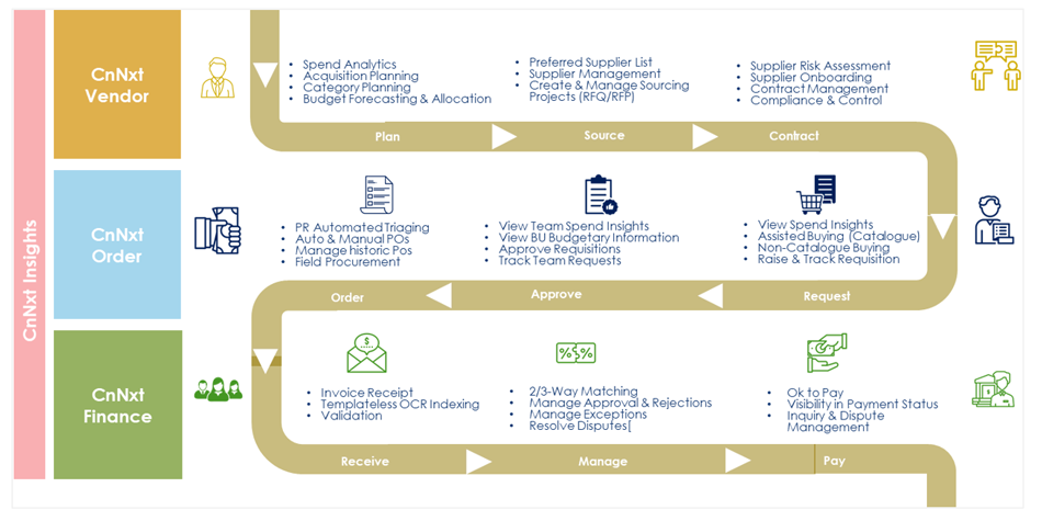 Overall, CnNXT adopts an integrated approach, a P2P ecosystem that provides a centralized control room for managing all plug and play modules: CnNXT Order, Finance and Vendor, as well as leading third party tools that best fit your organization. Our comprehensive discovery combined with modular solutions help enterprises realize value across productivity, spend, working capital and compliance without compromising on agility and scalability.