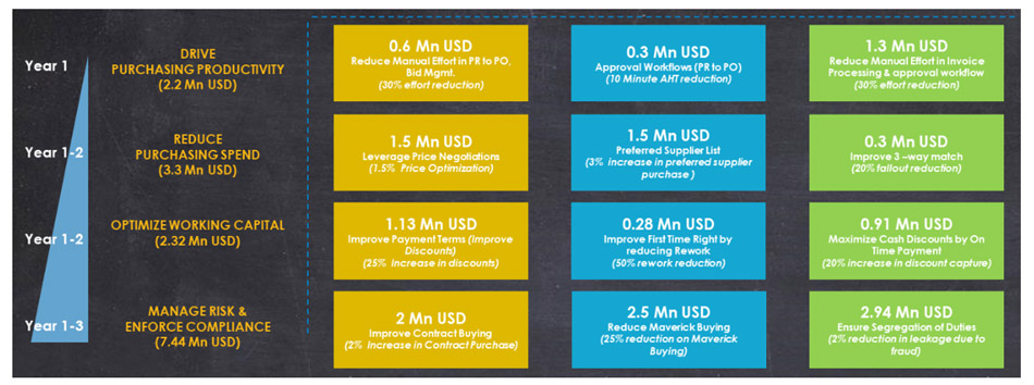 Based on Wipro’s experience in working with multiple customers in the S2P domain for the last few decades, we have noted that 8 to 12% value of your process is hidden behind non-obvious inefficiencies in the system. When talking about value realization, organizations often look at just the employee productivity aspect and fail to see that there are many other opportunities available to unlock savings or cut costs.