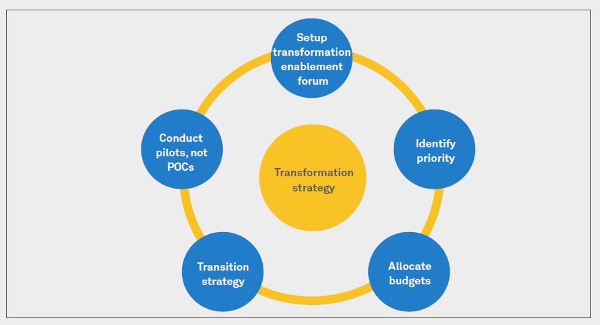 Transformation is integral to any organization’s business strategy, thanks to the ever changing digital business landscape. While organizations across board realize the need for transformation, what sets the leaders apart is their unwavering focus on the five building blocks that form the core of a robust transformation strategy (Figure 1).