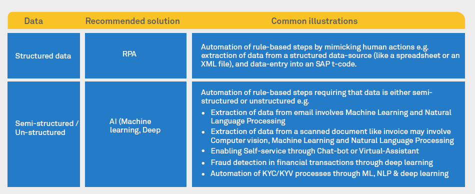 High-volume processes : If the processes have high volumes leading to impacts in SLA achievements or accuracy issues, then automation is the way to go. Automation can have following variants depending on process and input-data types: