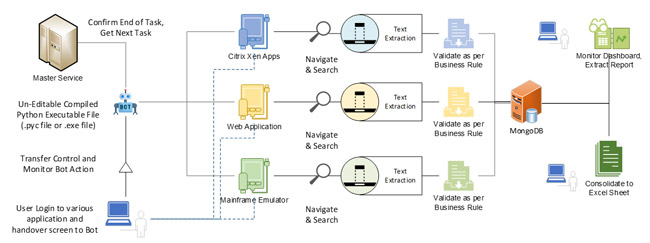The orchestration platform takes in account the priority of individual bots, with an overall objective of optimizing the cost of operations, reducing cycle time, improving productivity while monitoring real-time exceptions and reporting them, thereby maintaining high standards of accuracy and compliance for in scope process automations.