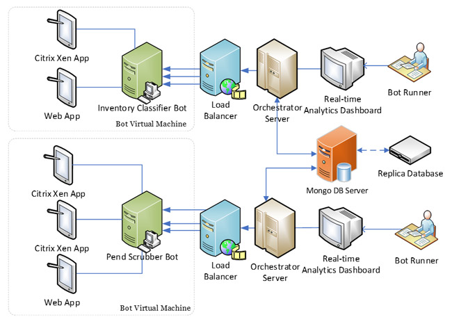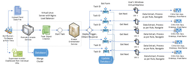 To fix this, we leveraged web-services with load balancing features coupled with auto-sensing mechanism and prescriptive algorithms to produce a scalable orchestration platform for guided deployment of pre-determined number of bots as a scheduled task. The task can be scheduled to execute both attended and unattended bots.