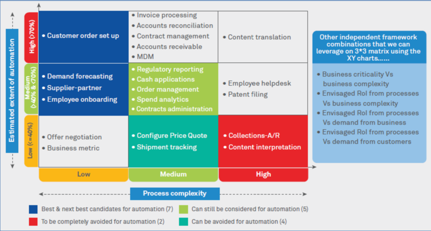 a) The approach: Empirical approach to discovering automation is a numerical and matrix driven approach that examines data points such as complexity of a Level 4 area generally taking up to 2-3 days per activity. Typical activities carried out include analysis of AS-IS state, data and documents along with SME conversations and creation of a business case. For e.g. a Level 4 activity of Candidate Sourcing captures data points such as, the extent of straight through (STP), number of associates on the task, volume of the activity, average handling time of the activity, extent of automation, business criticality, customer demand etc. and by plotting all of these on matrices or visuals, decision making is enabled. Below is a sample mapping of some L4 level automations for an understanding (See the example in Figure 2).