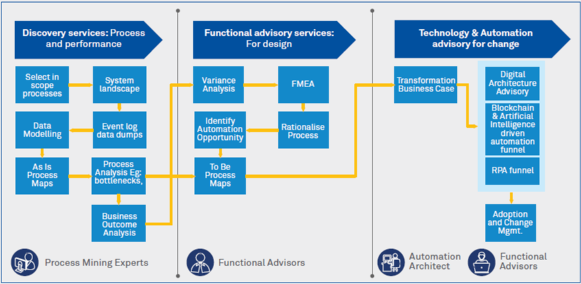 a) The approach: A multi-pronged approach is used for Comprehensive Mode Of Discovery involving process mining tools for cost reduction, elimination of any activity based inefficiencies, sets a precedence for standardization of activities, reduces manual intervention and enables prioritization of automation initiatives. Analysis of an Level 2 activity such Talent Acquisition (TA) as or a Level 3 activity such as Candidate Sourcing typically takes up to 2 weeks using this method. An indicative approach is depicted in (Figure 3).