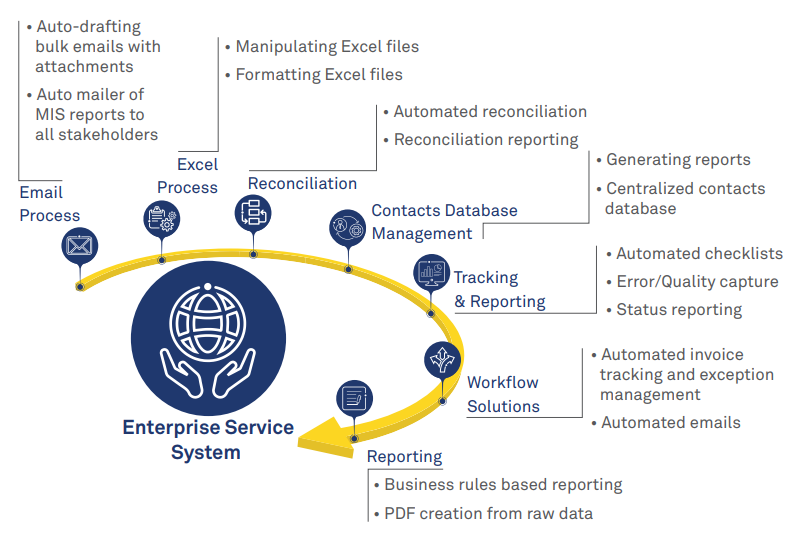 Manual touchpoints and use of Macros were the biggest challenges the bank faced on a routine basis. Manual management of invoice reconciliation led to issues like overpayment, duplicate payment, incorrect allocation, and delayed payment to customers. Also, a large number of Excel Macros were used for reporting, in both, brokerage and loan syndication. While Excel Macros provide short-term efficiency gains, they carry inherent risk of failure, which can result in operational loss due to erroneous reports. The challenge was to find a solution, which could eliminate significant manual effort and End User Computing from investment banking domain operations.