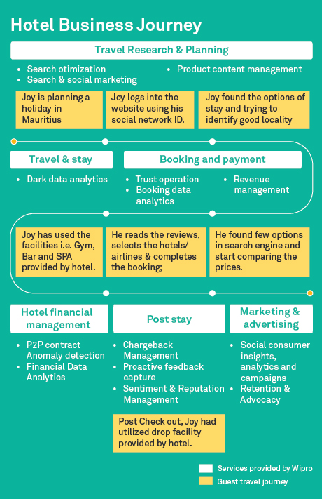 Through omnichannel solutions for B2B and B2C customers, Wipro orchestrates voice, chat, emails, web, and social media to provide consistent customer experiences. We offer more than 25,000 digital resources (from baggage claim and cargo status, to managing loyalty miles and flight itineraries) to provide state-of-art care for travel and hospitality clients across the globe.