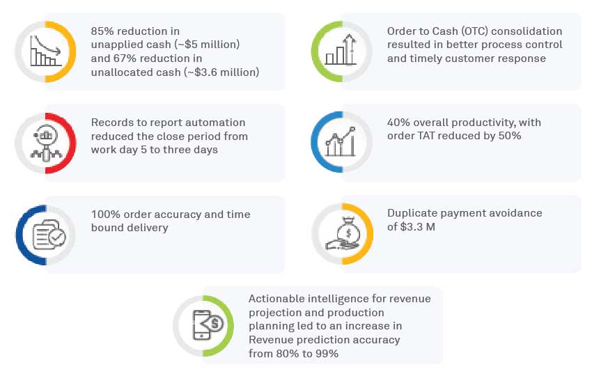The deployed solutions helped in cost saving and improved process efficiency. They positively impacted business in the following ways: