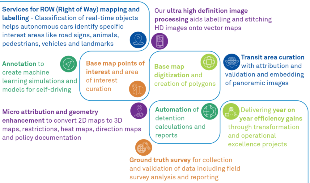 Wipro's geospatial services create, manage and maintain map and data services for leading companies. These geospatial services are used for navigation apps, ride-hailing, autonomous cars, 3D analysis, utility asset management, urban studies, map and data services.