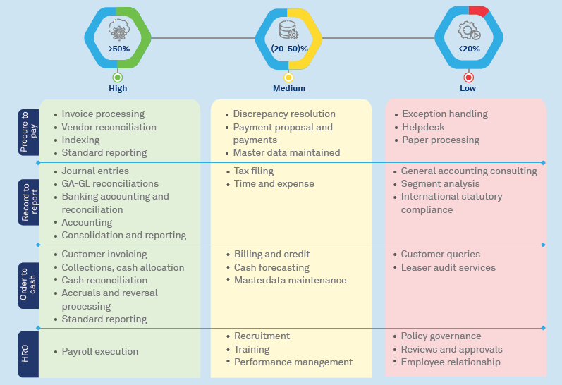 The processes of record to re-port (RTR), procure to pay (PTP) and order to cash (OTC) have higher applicability than the HRO processes. Here, high applicability translates into RPA potential of 50% or greater, medium is 20% to 50%, and low applicability is automation of less than 20%. We need to target the high and medium processes first during automation deployment to strengthen the RPA case.