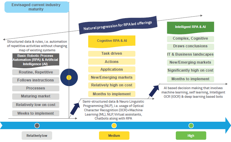 Currently, the market is in a zone somewhere between basic RPA service and cognitive RPA (Figure 2: RPA & AI progression roadmap).