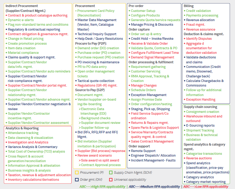 While the above are only indicative use cases, consider the following heat map (Figure 3: use cases heat map) to understand the gamut of offerings RPA & AI could further encompass. The heat map below covers an indicative area of offerings within the SCM, OM & Procurement domain and it is only indicative but not exhaustive.