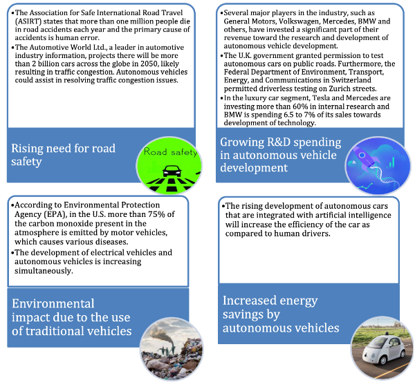Autonomous vehicles are a key innovation in the automotive industry; however, the potential impact with respect to the uptake remains indistinct. The development of supportive regulatory framework, government funding, and investment in digital infrastructure are expected to play a key role in positively impacting market growth. Growth across the mobility service sector may provide an impetus to the growth of the autonomous car market. North America is expected to witness significant growth owing to the amendment in the traffic regulation in the U.S. to incorporate autonomous cars on public roads.