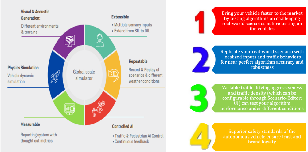This system could also simulate multiple weather and day of time conditions and shows real time sensor data from cameras and LIDARs. The simulator is highly scalable and can be used in replicating specific world environments as well to test vehicles within such scenarios and conditions.