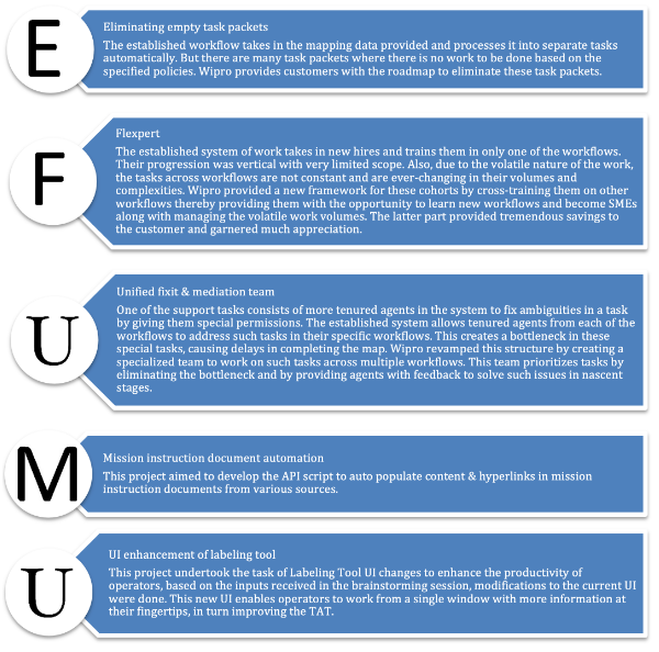 Automation opportunities and Lean initiatives are identified to ensure that the solution provided stays relevant with time. Projects executed by Wipro include: