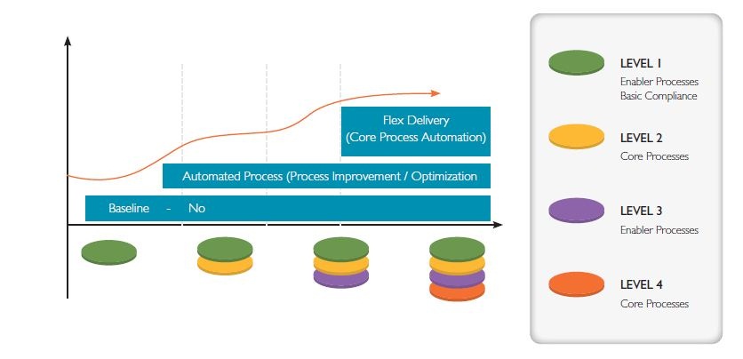 Standardization of delivery is deployed not just on core business processes outsourced by the customer but on enabler processes as well. Enabler processes are those which support the delivery of core processes. Service providers integrate standardization of core and enables processes in their quality framework. Standardization approach is a four level model called the standardization capability model (Figure 2).