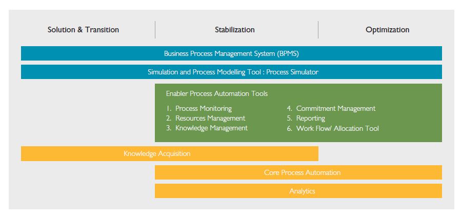The “Process Lab” initiative leverages technology for process standardization. Process Lab plays a vital role in driving a cultural shift in the organization in moving from manual work methods to automated processes through application of tools and technology. Process Lab journey starts from institutionalizing business process management system (BPMS) in transition of new processes (Figure 4). It helps in development and deployment of several tools that help in managing the delivery across the entire process life cycle. Process Lab diversifies into three work streams;