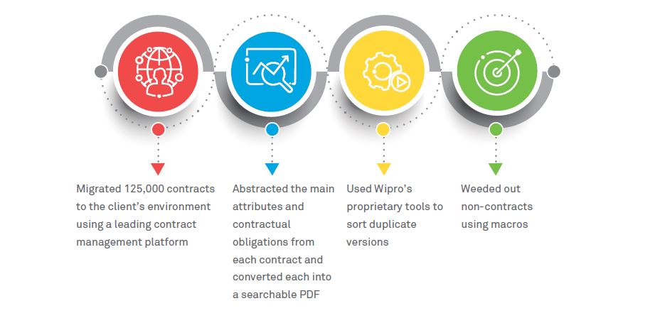 Wipro moved all acquired entities’ contracts to the client’s CLM platform, weeding out all fake and irrelevant documents.