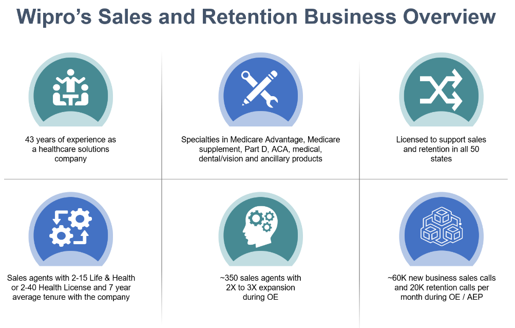 • Wipro hires, trains and manages the licensed agents who work as an extension of the health plan's internal team to support direct-to-consumer sales, member renewals, and other existing channels like brokers and agencies