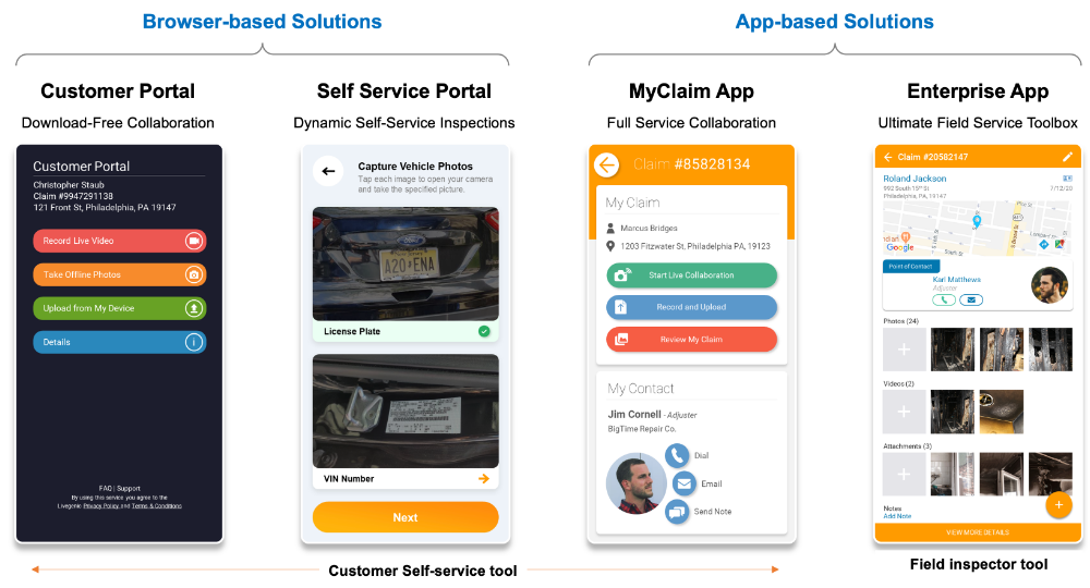 Our solution leverages a virtual collaboration platform that accelerates the claims inspection process, toward a faster claims settlement. It aids in gathering damage evidences in the form of photos, videos, witness testimony and proof of insurance and to share it with the insurer in real time. The digital platform is designed for customers as well as field inspectors. The platform includes both browser-based and app-based tools, each of which can work in either live or offline environment.