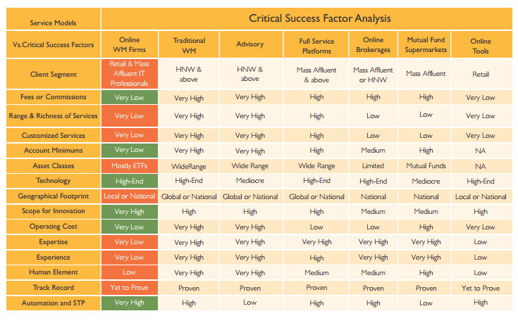 A CSF (Critical Success Factor) Analysis (table below) was also carried out for the Online WM Firms on the existing business models in the Wealth Management Industry. It reveals the bright (in Green) and grey (in Red) areas in 15 different aspects that would drive the future of these firms. Let’s analyze in detail how the online WM model stands against each one of them.