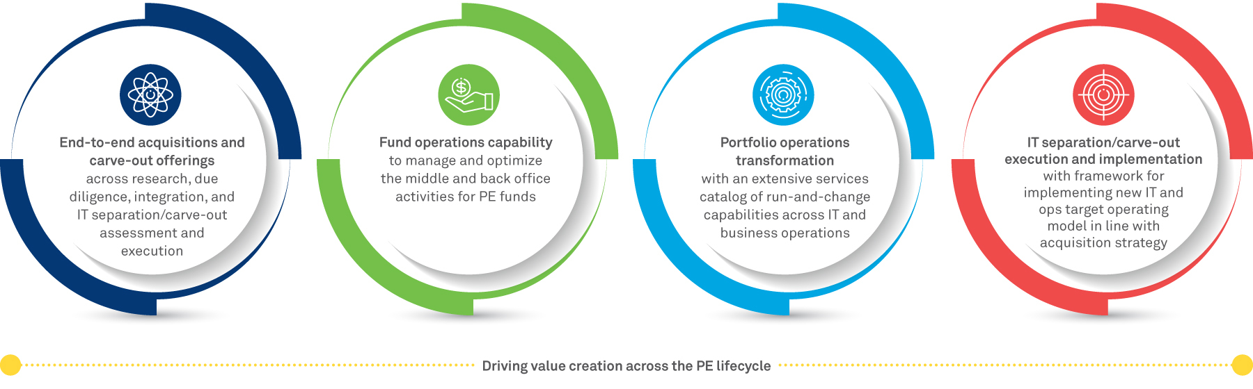 Private Equity (PE) firms are focused on value creation for their stakeholders through a combination of their investment strategy and portfolio operations expertise. This requires deep knowledge of industry processes, value drivers, transformation options, and a cost optimization strategy. Wipro accelerates the value creation process with its offerings across the Private Equity value chain.