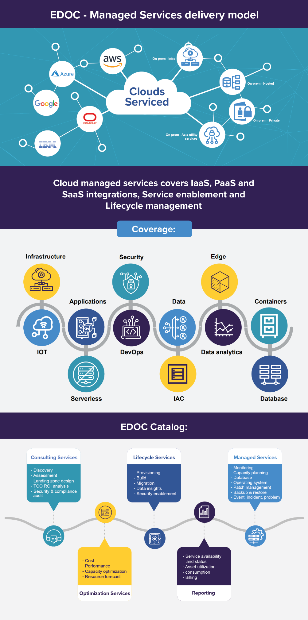EDOC services span across hybrid multi-clouds (public and private) involving IaaS and PaaS along with cloud native services, DevOps, micro-services, containers, IoT and enabled with data analytics based on artificial intelligence (AI), machine learning. It provides customers with the ability to manage multi cloud environments with a 360-degree view of service availability, service efficiency, resiliency and acts as a trusted advisor to expand their cloud portfolio.