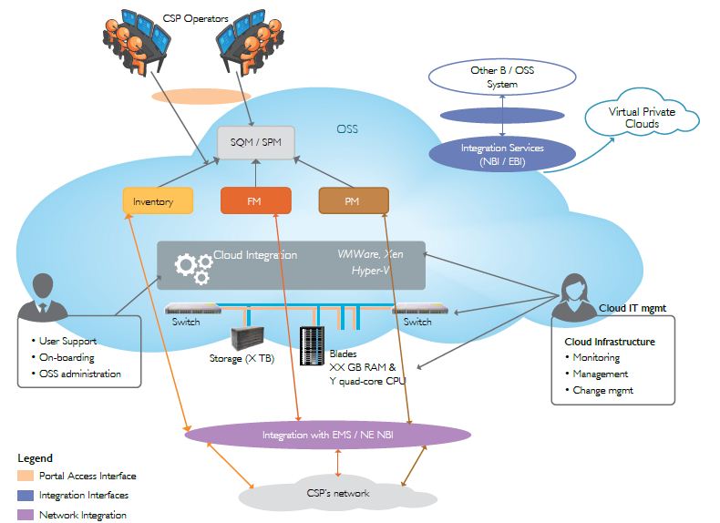 Cloud-based infrastructure offers an efficient and easy way to enable resource sharing, automation and monitoring. We propose a cloud hosted OSS solution for Tier 1 CSPs. In this model, CSPs host the OSS solutions within their private cloud (see figure 2). It provides the flexibility to scale operations on-demand and simplifies software upgrade procedures, reducing costs considerably.