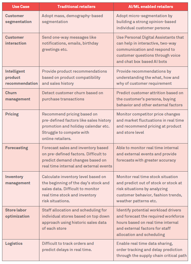 In addition to helping retailers customize their offers, AI and ML enable predictive analytics, allowing retailers to project the details of a customer’s history into the future, and calculate outcomes for events such as product sales or store renovations. Understanding these outcomes vastly increases retailers’ ability to prepare for events and respond to customers proactively. Thus, AI and ML offer enormous potential for retailers to deliver compelling customer experience, drive cost efficiencies, and even improve employee motivation. Data analytics, AI and, ML have already begun to disrupt the way retailers do business. Retailers that successfully adopt digital technologies will reap competitive advantages.