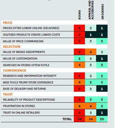 Online competition increases predictably as online prices, selection, convenience, and customer trust improve relative to physical stores. Here’s how three industries scored for key drivers (1=low; 5=high). Try this yourself: If your total is between 30 and 35, digital capabilities are or will soon be a strategic priority for your firm. If it’s below 30, you should focus on developing digital tools to build traffic, enhance in-store experience, and increase basket size before competitors do.