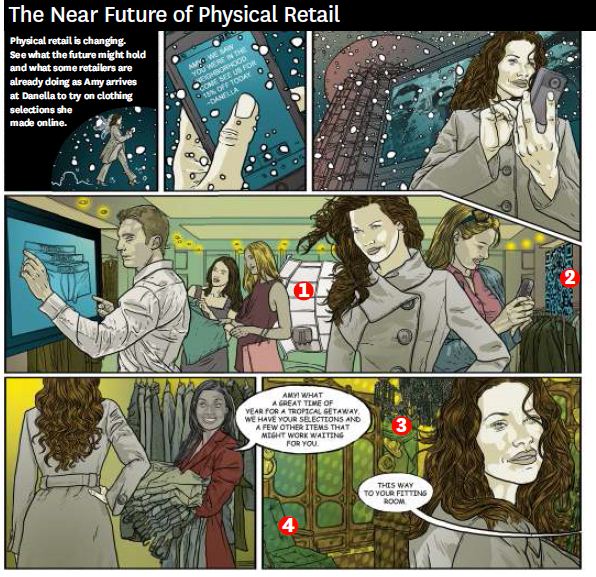As Amy enters Danella, a sales associate greets her by name and walks her to a dressing room stocked with her online selections—plus some matching shoes and a cocktail dress. She likes the shoes, so she scans the bar code into her smartphone and finds the same pair for $30 less at another store. The sales associate quickly offers to match the price, and encourages Amy to try on the dress. It is daring and expensive, so Amy sends a video to three stylish friends, asking for their opinion. The responses come quickly: three thumbs down. She collects the items she wants, scans an internet site for coupons (saving an additional $73), and checks out with her smartphone.