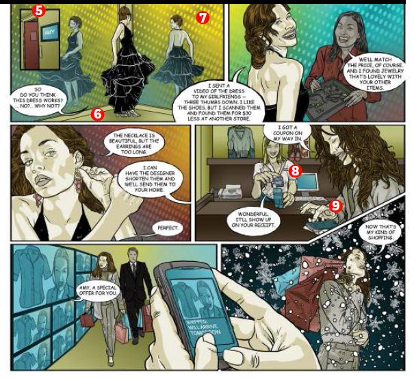 As she heads for the door, a life-size screen recognizes her and shows a special offer on an irresistible summer-weight top. Amy checks her budget online, smiles, and uses her phone to scan the customized Quick Response code on the screen. The item will be shipped to her home overnight.
