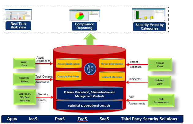 Wipro’s Cloud Security Compliance Assurance Program provides a holistic approach for Cloud Risk Assessment. It uses an effective strategy to treat and mitigate risks, utilizing Wipro’s Common Control Framework and best practices to proceed with recommendations and implement appropriate controls. This service is delivered using our Cyber Defense Platform, which uses a top down questionnaire based threat assessment method by leveraging MITRE attack framework, SANS threat vectors and SANS top 20 critical security controls. The platform also uses best of breed technologies like QualysGuard for vulnerability assessment and provides a real time assessment of regulatory compliance posture and efficacy of controls adopted. We provide quantified predictive risks obtained by Monte Carlo simulation of business criticality and associated risks of respective assets. We also provide qualitative inputs on risks derived at organization level, control level and asset level.