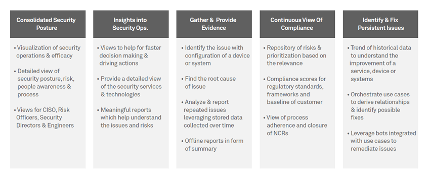 SMC provides a unified view translating individual tool views/ reports into meaningful dashboards to stakeholders within the enterprise hierarchy. For instance, an executive view for the CISO shows whether any risks are manifesting due to ineffective or inconsistent application of security controls or if configurations are not meeting the baselines. Similarly, it provides an operational view to Operations Manager and a technology view to Analysts and Engineers.