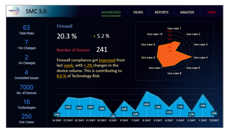 Its unique proactive approach to provide insights into the security infrastructure gives organizations visibility into their security posture. Wipro uses Security Management Center to visualize the security infrastructure, holistically to view its customer’s security posture.