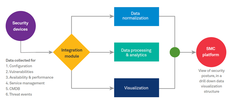 The health monitoring tool is hosted in the data center, which monitors the infrastructure security devices including firewall, load balancer, forward proxy, end point security management servers, etc. to collect health and performance related data, for analysis and reporting to SMC. The data gathered from all the above processes are then sent to the database of SMC platform, where it is further correlated and aggregated, to provide integrated visibility towards security infrastructure and security posture. SMC portal shows consolidated view of security posture as operational risk, efficiency and reliability view, with the capability to drill down to individual device status.