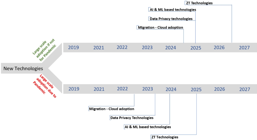 The release of regulations is closely linked to the adoption of new technologies, specifically when those technologies can potentially impact organizations and the sector at large (e.g. UAE’s Critical Information Infrastructure Protection Policy). Faster adoption of technologies during the pandemic has therefore led to faster roll out of regulations. The diagram below shows the timeline of technology adoption since to pandemic compared to the estimated timeline had the pandemic not occurred.