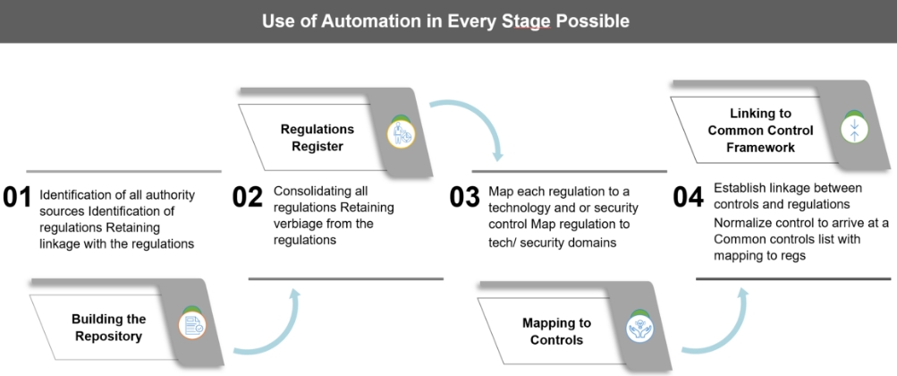 The first step in developing a strong regulatory compliance program is to develop a robust repository of regulations, one that is comprehensive and continuously updated. This will ensure that the organization is always up to date on the latest regulations and able to map them to common control. The diagram below shows several ways a well-maintained repository can benefit technology and cybersecurity operations.