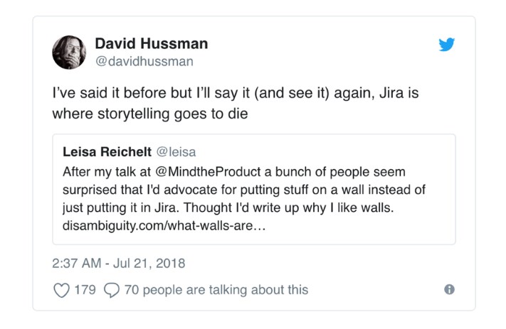 Not only can everyone see the status of each user story and who is working on them, people can also freely raise issues and concerns. With full traceability of conversations and decisions, we foster an open and trusting environment for the team.