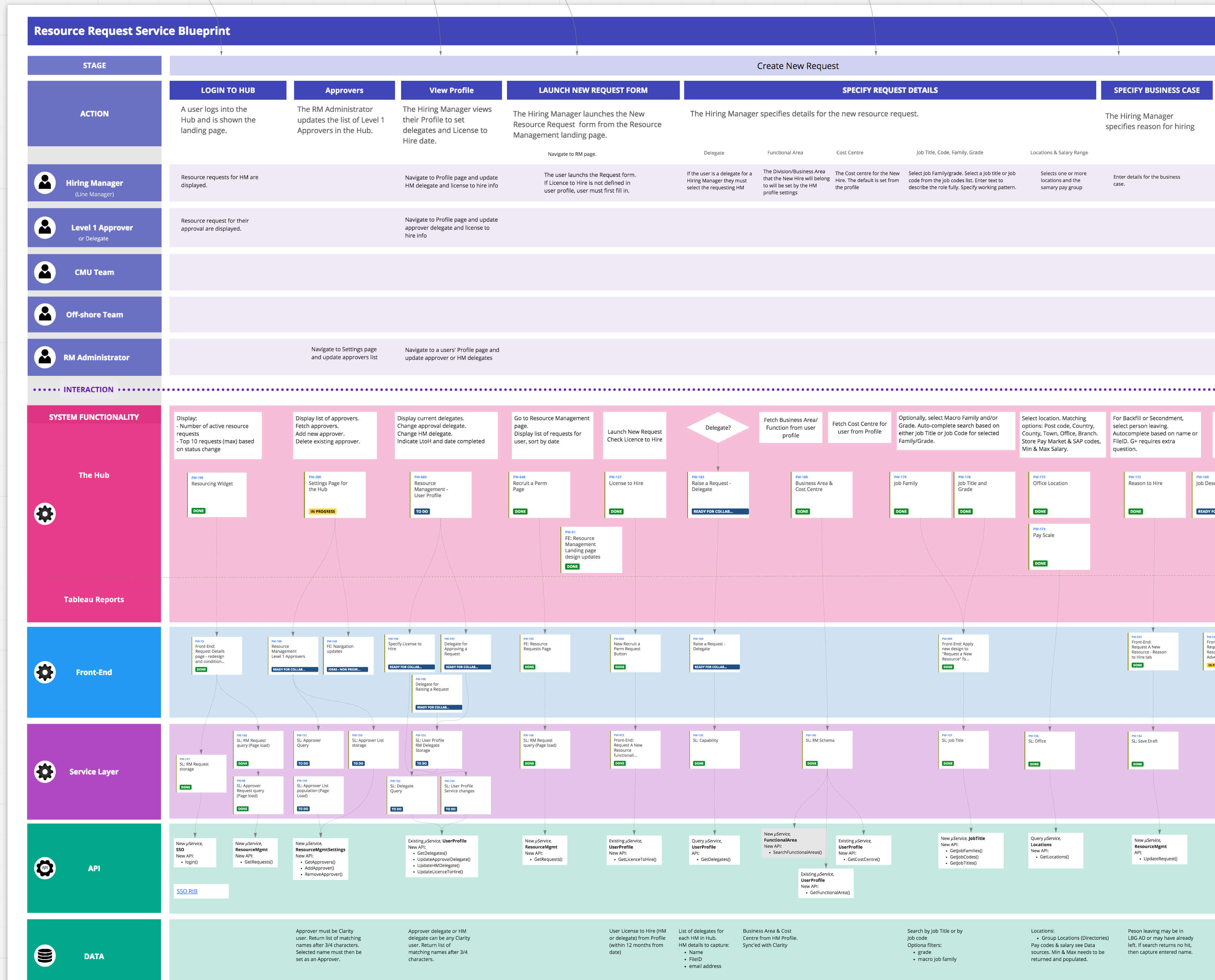 Hosted online, the Project Wall now becomes a place where members located across the globe and in different disciplines share ideas, organize user stories, and link to supporting artefacts and resources. Within this framework, the Service Blueprint transforms from a high-level diagram into a complete map of the project including all the guts of the new service. It details user stories that the project will execute on, what the touchpoints look like, which data are needed, which APIs need to be built and so on. This level of detail will inspire insights and conversations that a high-level blueprint typically fails to generate.