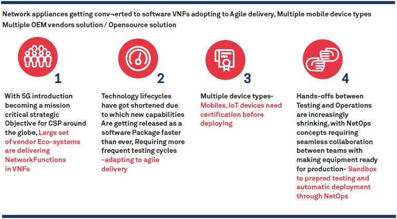 Hence, to address telco operator rollout vision, a single test partner who can set up and maintain various test environments by bringing in the required test tools, and develop an automation framework for faster field rollout, would add a lot of value.