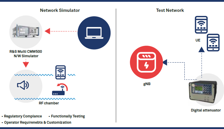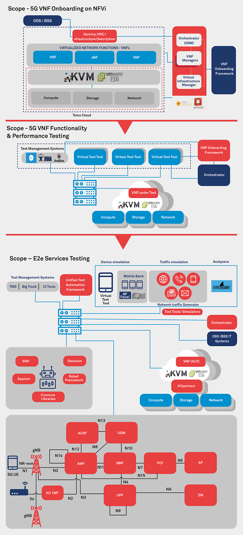 Since a telco operator has multiple RF bands to operate 5G network across multiple business segments, several test topologies are envisioned with combinations of Local Data Centre, Regional Data Centre, and National Data Centre deployment. A telco operator’s biggest challenge is to set up various combinations of Data Centres (NFVi) and test the solution. As the testing scope spans across devices and network applications, multiple test tools / simulators and a test environment need to be setup and maintained.