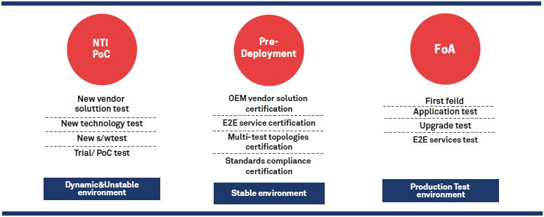 Because the products are getting virtualized and delivered in agile mode, telco operators are challenged with quicker time-to-market of their products with utmost customer experience. Hence the need of setting up test labs arise to certify multi-vendor VNFs and devices before they are rolled-out in the production network.
