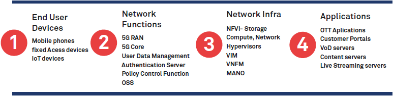 Telco operator 5G network consists of Telco Cloud, Virtual Network Functions from multiple vendors, Network applications, and End-user devices. As a green-field operator, a telco operator’s objective is to integrate all 5G network ecosystems and certify the end-to-end solution in a controlled test lab environment before field deployment to: