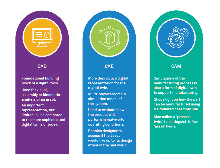 Traditionally, engineering design teams use computer-aided tools to design assets. A bicycle manufacturer might use Computer Aided Design (CAD), Computer Aided Engineering (CAE) and Computer Aided Manufacturing (CAM) across the entire product life cycle. These representations of assets are not new. Early applications of CAE date back to the late 1960s, most notably, by Dr. Swanson who developed the first version of ANSYS – a CAE tool – in 19703. Designs of complex machines such as gas turbines and jet engines, internal combustion engines, locomotives, automobiles, and so on rely upon CAx technologies to limit costly experimentation and testing, so designers can improve their confidence on how the part will behave in the field even before building a single part. Such computer-aided representations, in addition to insights gleaned from controlled experiments, allow us to evaluate how the asset will perform in the field, as well as optimize how it is manufactured – thereby serving as an important digital twin representation of the asset. These form the ‘as-designed’ and ‘as-built’ digital representations of the asset.
