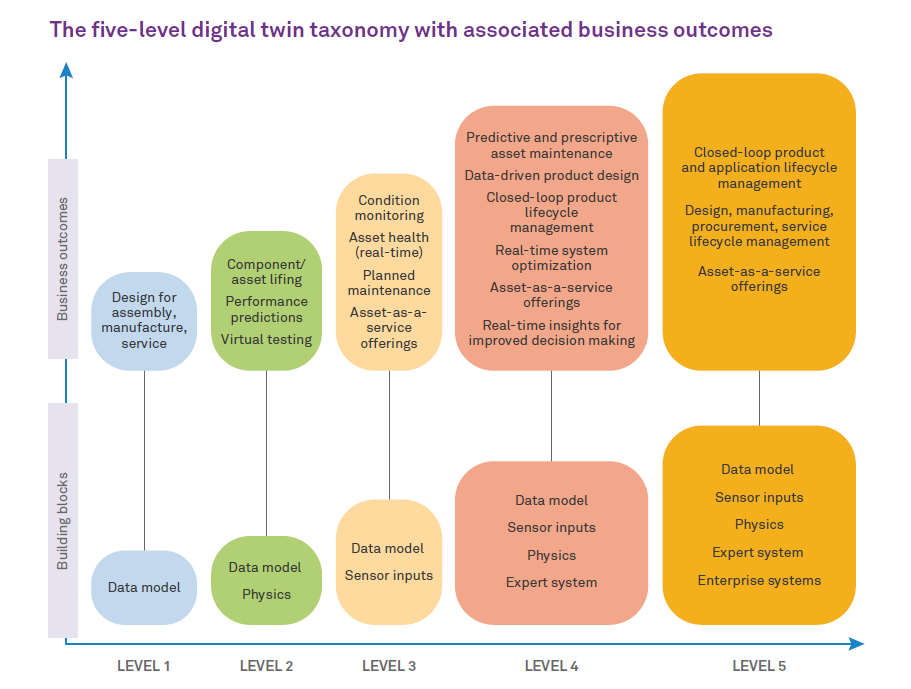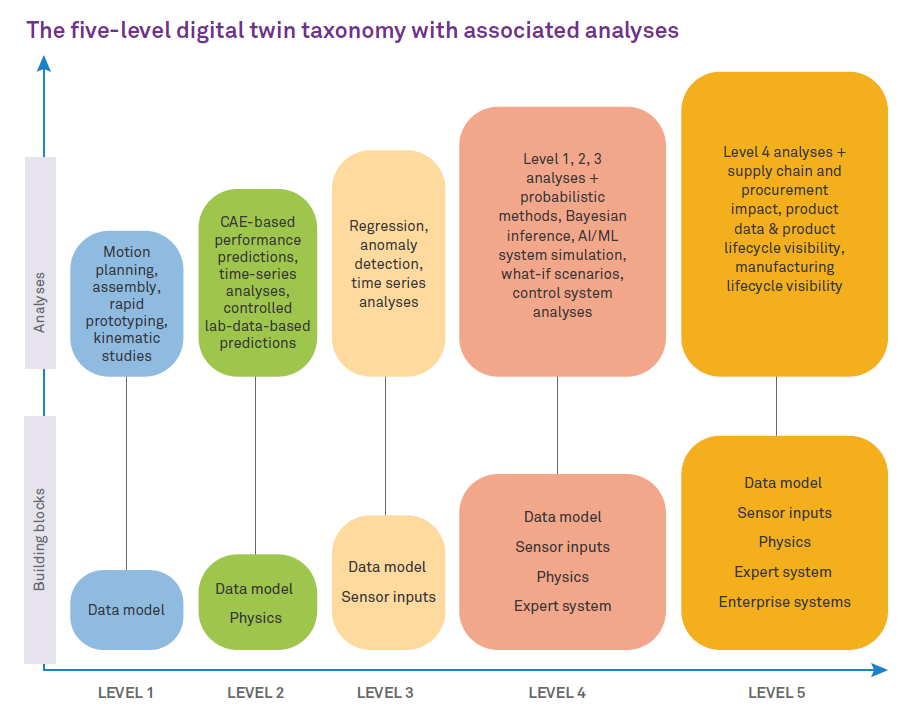 For industrial products or assets, a fundamental representation of a digital twin is a data model of the asset, which can be as simple as the CAD model itself. We refer to this generic description of the asset as a ‘data model’ in the taxonomy. The Level 1 representation when augmented with physical simulation insights such as from CAE or controlled lab experiments leads to a Level 2 digital twin. A digital representation that couples the sensor data from the field with the data model is a Level 3 digital twin. A digital twin that uses design insights, sensor data, asset physics, along with expert ‘human knowledge’ encoded into the digital twin, is a Level 4 digital twin representation. The most sophisticated digital twin in this taxonomy is Level 5 where the digital twin uses sensor data, physics-based insights and models, expert ‘human knowledge’ along with integration with enterprise systems such as Product Lifecycle Management (PLM), Enterprise Resource Planning (ERP), and Manufacturing Execution Systems (MES). We consider the Level 5 digital twin representation as the most sophisticated representation because it leverages information from multiple enterprise sources to provide a comprehensive view of all aspects of the asset.