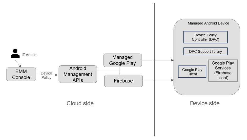 EMM Console is a web application allowing IT administrators to handle all enterprise-managed mobile devices and on-device apps via Android Management APIs. Using these APIs, applications can manage (create, delete) an enterprise profile, assign managed devices, and manage (create, delete, enforce, modify) policies on managed devices. Android Management APIs can also be used by EMM service providers such as Google, SOTI, and Airwatch to extend available products and services.