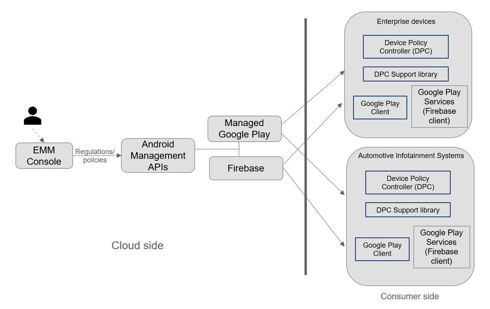 As with enterprise device management, Android infotainment systems can be considered as managed devices, and remote authorization features can be used where policies will be specific to automotive restrictions.